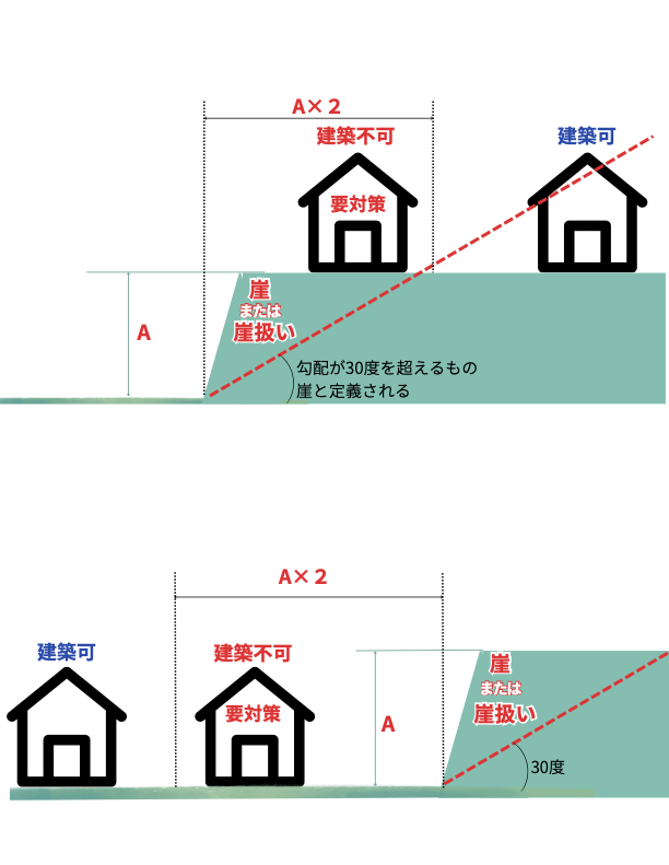 - 見た目が平らな土地でも、すぐ裏が崖なら安息角の制限を受ける可能性があります。