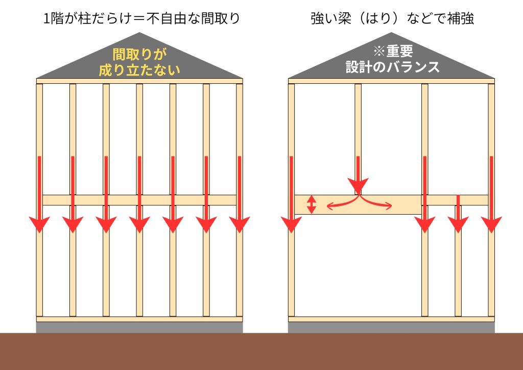 家も同じです。 2階の重みを1階の柱が最短距離で地面へ伝えていれば、家は無理なく長持ちします。