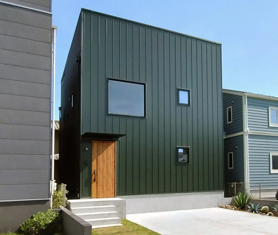 葉山の青空に映えるディープグリーンのガルバリウム外壁