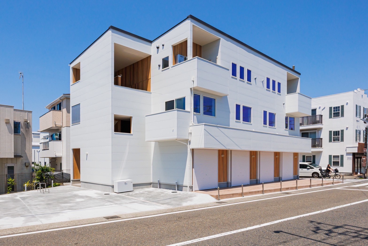 東海道線辻堂駅南側、通称サーファー通り沿いの物件です。おしゃれな雰囲気の店舗が数多い地域です。海にも近い事や店舗の特殊を生かして欲しい事から白い外壁に木目のアクセントを少し配色しました。